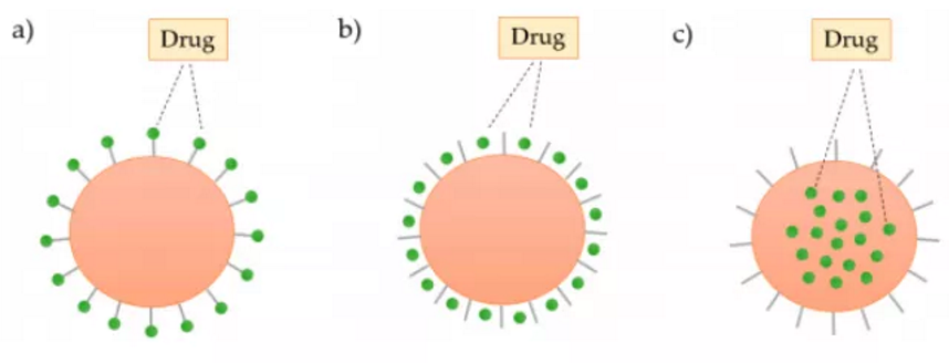 圖2. 樹枝狀大分子與藥物的三種結(jié)合方式,a) 共價(jià)連接;b) 靜電相互作用;c)包封