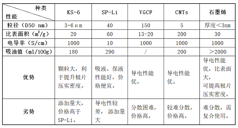 鋰離子電池用導(dǎo)電劑可以分為傳統(tǒng)導(dǎo)電添加劑(如導(dǎo)電石墨、導(dǎo)電炭黑、碳纖維等)和新型導(dǎo)電添加劑(如碳納米管、石墨烯、復(fù)合導(dǎo)電漿料等)。市面上常見(jiàn)的導(dǎo)電劑有KS-6、KS-15、SFG-6、SFG-15、SPUER Li、S-O、350G、乙炔黑(AB)、科琴黑(KB)、氣相生長(zhǎng)碳纖維(VGCF)、碳納米管(CNT)、石墨烯等。幾種代表性的導(dǎo)電添加劑關(guān)鍵性能及優(yōu)缺點(diǎn)如下表。